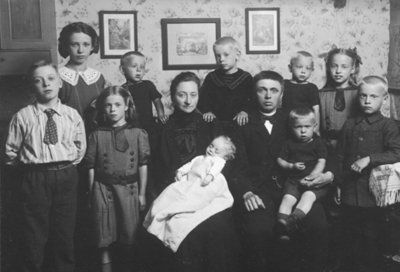 Alfreds forældre, Marie og Jens, med alle 10 børn - 1914 Den 23. november 1935 har Alfred sammen med enkelte af hans søskende, Olga, Arthur og Axel købt navnet Deres oprindelige ønske var at hedde Grene-Jensen, da nogle af deres forfædre hed Grene I stedet faldt valget på navnet Granum-Jensen. Granum skulle efter sigende have en oprindelig betydning af frø eller kerne. De fire søskende syntes at det var et passende navn - også som betydning for en spirende familie. I 1970'erne valgte nogle af Alfred og Kirstines børn, Knud, Erik og Tage at fjerne Jensen, således at de og deres efterkommere idag kun hedder Granum til efternavn. |
